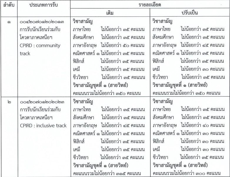 ล่าสุดหลังจากที่ ม.บูรพา และ มศว ประกาศลดในบางคณะแล้ว วันนี้มีของ ม.เชียงใหม่ ที่ปรับลดเกณฑ์ขั้นต่ำในโครงการ CPIRD ที่เปิดรับในโควตาภาคเหนือ ทั้งโครงการ Community Track และ Inclusive Track โดยจะมีการปรับลดในบางวิชา รวมทั้งรอบ 3 Admission ก็มีการปรับเกณฑ์ขั้นต่ำเช่นกัน
