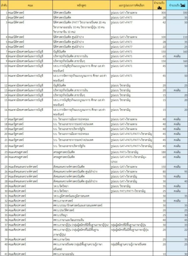 แต่ไม่ว่าจะเป็นวิธีไหนก็ถือว่าเป็นเรื่องดีๆ ค่ะ เหมือนกับที่ ม.ธรรมศาสตร์ ก็ได้ออกมาแจ้งว่ามีการปรับจำนวนที่นั่งมากถึง 1,467 ที่นั่ง จาก 123 สาขาวิชา นับๆ ดูแล้วก็เพิ่มจำนวนรับเกือบทุกสาขาเลยค่ะ จะมีสาขาในฝันของน้องๆ หรือเปล่า ไปดูกันเลยค่ะ