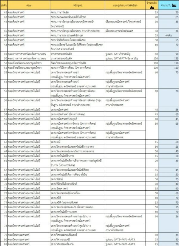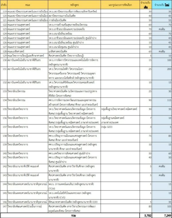 และนี่ก็คือรายละเอียดการเปลี่ยนแปลงจำนวนการรับสมัครของมหาวิทยาลัยธรรมศาสตร์ บ้างก็เพิ่มจำนวนรับหลายสิบที่นั่ง เช่น SIIT หลักสูตรวิศวกรรมศาสตร์ เพิ่มจาก 25 ที่นั่งเป็น 200 ที่นั่ง หรือ คณะยอดฮิตอย่าง วารสารศาสตร์, นิติศาสตร์, พาณิชยศาสตร์และการบัญชี ก็มีรับเพิ่มเช่นเดียวกันค่ะ