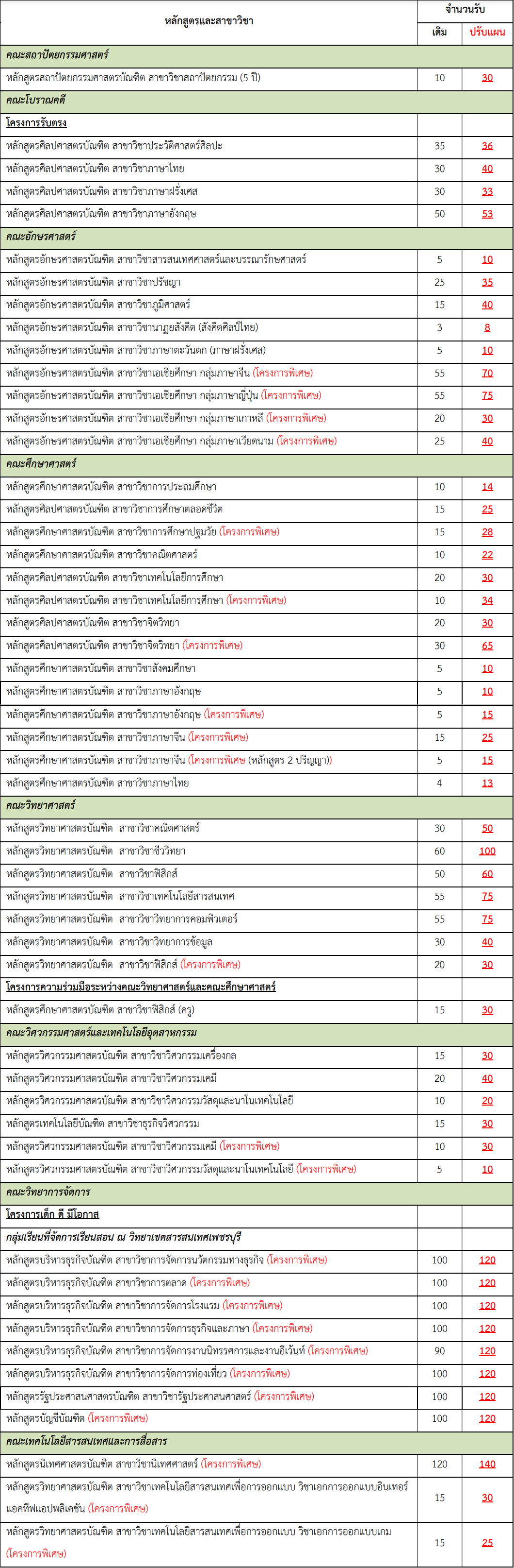 ก่อนหน้านี้ มหาวิทยาลัยศิลปากร เปิดรับสมัครรอบ Admission ทั้งหมด 11 คณะ รวมกว่า 4,309 ที่นั่ง แต่ล่าสุดมี 9 คณะ ที่ปรับจำนวนที่นั่ง รวมรับเพิ่มอีก 759 ที่นั่งกันเลย โดยมีคณะ และสาขาวิชาที่ปรับเพิ่มตามรายละเอียดดังนี้