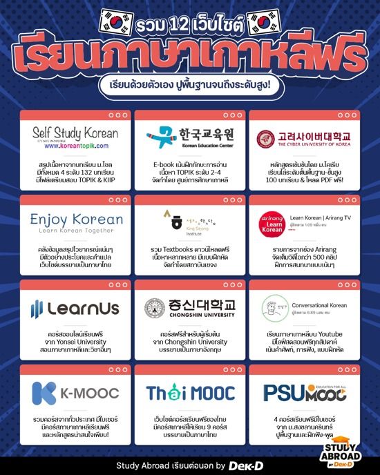 안녕하세요! ใครที่อยากเรียน 'ภาษาเกาหลี' แต่ไม่มีเวลาไปเทคคอร์ส วันนี้เราได้มัดรวม 12 เว็บไซต์แหล่งข้อมูลดีๆ ที่เปิดให้ทุกคนเข้าไปเรียนฟรีแบบ self-study มาฝากกัน มีทั้งแบบปูพื้นฐานสำหรับผู้เริ่มต้น รวมถึงบทเรียนไว้ฝึกเสริมทักษะสำหรับคนที่พอมีพื้นบ้างแล้ว 공부하자~