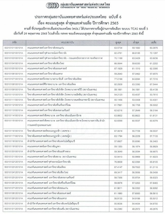 - คณะแพทยศาสตร์ที่มีคะแนนต่ำสุด สูงที่สุดในปีนี้ คือ คณะแพทยศาสตร์ จุฬาลงกรณ์มหาวิทยาลัย มีคะแนนต่ำสุดที่ 66.8185 ในขณะที่ปี 64 มีคะแนนต่ำสุด 72.8672 คะแนน