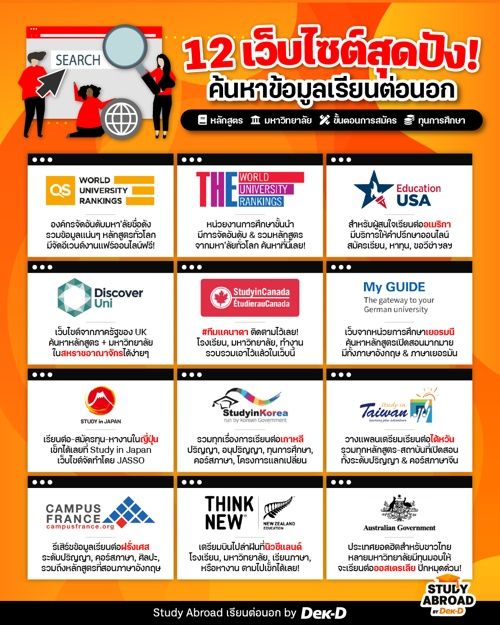 วันนี้ พี่วุฒิ ได้รวบรวมลิสต์ 12 เว็บไซต์ปังๆ จากประเทศยอดฮิต เช่น สหรัฐอเมริกา, UK, แคนาดา, ออสเตรเลีย, เกาหลีใต้และอีกเพียบมาฝากทุกคน ซึ่งบอกเลยว่าช่วยให้ชาวทีมเด็กนอกค้นหาหลักสูตรที่ใช่ สถาบันที่ชอบ และตอบโจทย์ไลฟ์สไตล์แต่ละคนได้แน่นอน ใครกำลังรีเสิร์ชข้อมูลอยู่ ตามไปปักหมุดด่วนๆ เลยค้าบบ