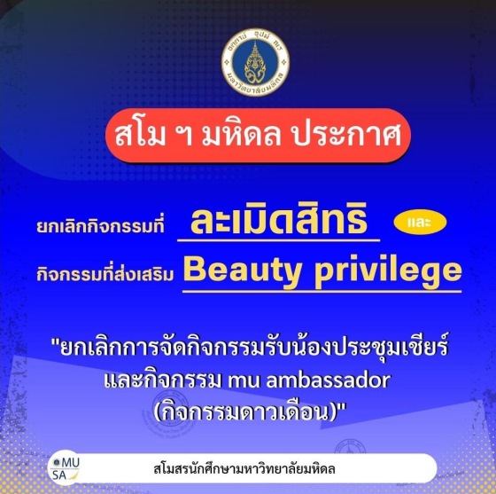 ด้านสโมสรนักศึกษามหาวิทยาลัยมหิดล ได้ออกมาประกาศว่า ทางสโมสรฯ มีมติเอกฉันท์ให้ยกเลิกการจัดกิจกรรมที่ละเมิดสิทธิ และกิจกรรมที่ส่งเสริม Beauty privilege ทุกรูปแบบ ซึ่งก็หมายรวมถึงยกเลิกจัดกิจกรรมรับน้องประชุมเชียร์ และ MU Ambassador หรือกิจกรรมดาวเดือน
