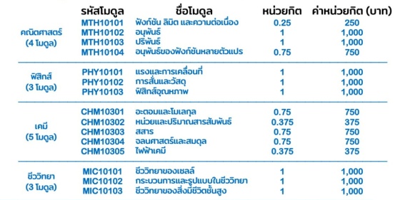 หมายเหตุ : ต้องเรียนให้ครบทุกโมดูลที่กำหนด จึงจะเทียบหน่วยกิตเป็นรายวิชานั้นๆ ได้