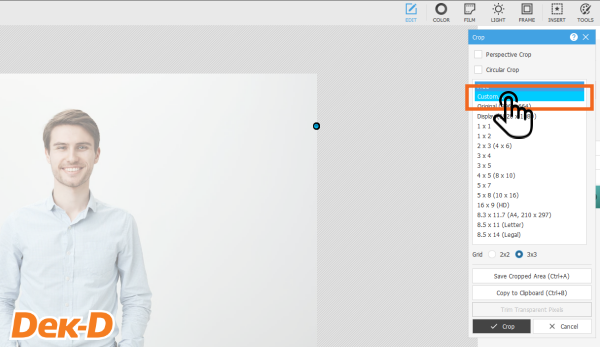 เมื่อเปิดรูปภาพมาแล้ว ขั้นตอนต่อไปให้เลือก Edit จากแถบด้านบน (ฟังก์ชันซ้ายสุด) จากนั้นเลือก "Crop" และเลือก "Custom" เพื่อตั้งค่าขนาดค่ะ