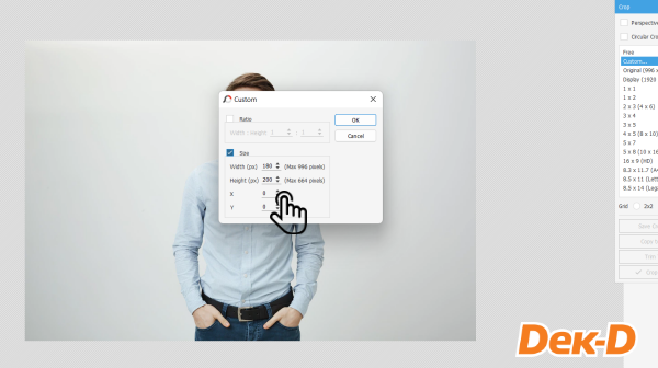 เมื่อกด Custom แล้ว โปรแกรมจะขึ้นหน้าต่างให้กำหนดขนาดของรูปภาพค่ะ ตรงนี้น้องๆ สามารถใส่ตัวเลขที่แต่ละเว็บไซต์กำหนดได้เลย