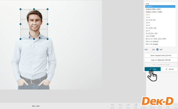 จากนั้นเลือกฟังก์ชัน Crop คล้ายกับการทำในโปรแกรมแต่งภาพ เมื่อกดไปแล้ว โปรแกรมก็จะมีกรอบขึ้นมาให้เราสามารถขยับหรือสร้างกรอบของรูปภาพได้อย่างอิสระ