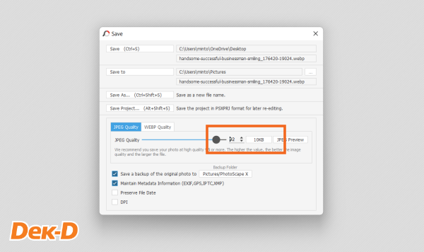 สุดท้ายเป็นขั้นตอนการ Save ค่ะ ในหน้านี้น้องๆ สามารถกำหนดคุณภาพของรูปภาพได้ และจะมีบอกขนาดของรูปภาพไว้ด้วย จะเห็นว่าจากรูปภาพตัวอย่างของพี่มิ้นท์ มีขนาดเพียงแค่ 10kb ไม่เกินขนาดที่ กสพท กำหนดแน่นอน!!! เพียงเท่านี้ก็เป็นอันเสร็จเรียบร้อยค่ะ