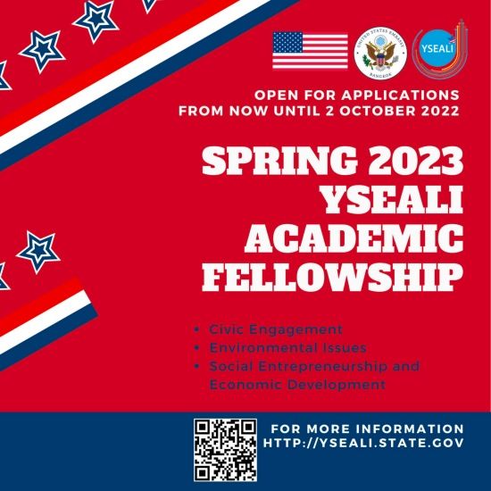 โครงการ YSEALI Academic Fellowship เป็นทุนของรัฐบาลสหรัฐอเมริกา แบบเต็มจำนวน ซึ่งรวมค่าใช้จ่ายในการเข้าร่วมโครงการทั้งหมด (ทุนนี้ได้รวมค่าตั๋วเครื่องบินไป-กลับสหรัฐฯ ค่าทำวีซ่า ค่าที่พัก และค่าอาหารขณะเข้าร่วมโครงการแล้ว) โดยมีกำหนดให้เป็นกิจกรรมแลกเปลี่ยนที่สหรัฐอเมริกา เป็นระยะเวลา 5 สัปดาห์ ซึ่งจะจัดช่วงต้นปี 2023 ที่มหาวิทยาลัยในสหรัฐอเมริกา*