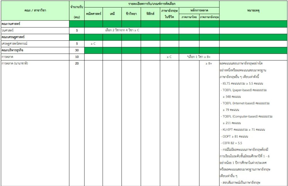 - เกณฑ์คัดเลือกแต่ละคณะแตกต่างกัน แต่ภาพรวม พิจารณาจาก GPAX, ผลสอบภาษาอังกฤษ, Portfolio และสอบสัมภาษณ์