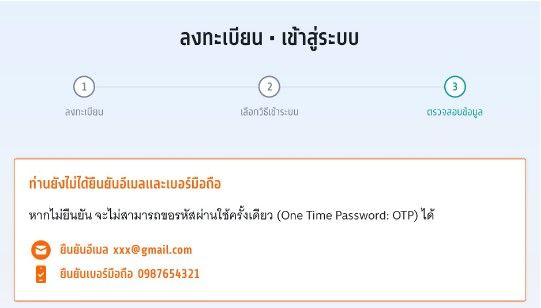 หลังจากกรอกข้อมูลและเลือกวิธีเข้าระบบแล้ว จะเข้าสู่ขั้นตอนการตรวจสอบข้อมูล ตรงนี้สำคัญมากๆ เพราะถ้าไม่กดตรวจสอบข้อมูล ก็จะขอรหัส OPT ไม่ได้ หรือใส่อีเมล/เบอร์โทร ไม่ถูกต้อง ก็อาจทำให้การสมัครติดขัดล่าช้าไปค่ะ