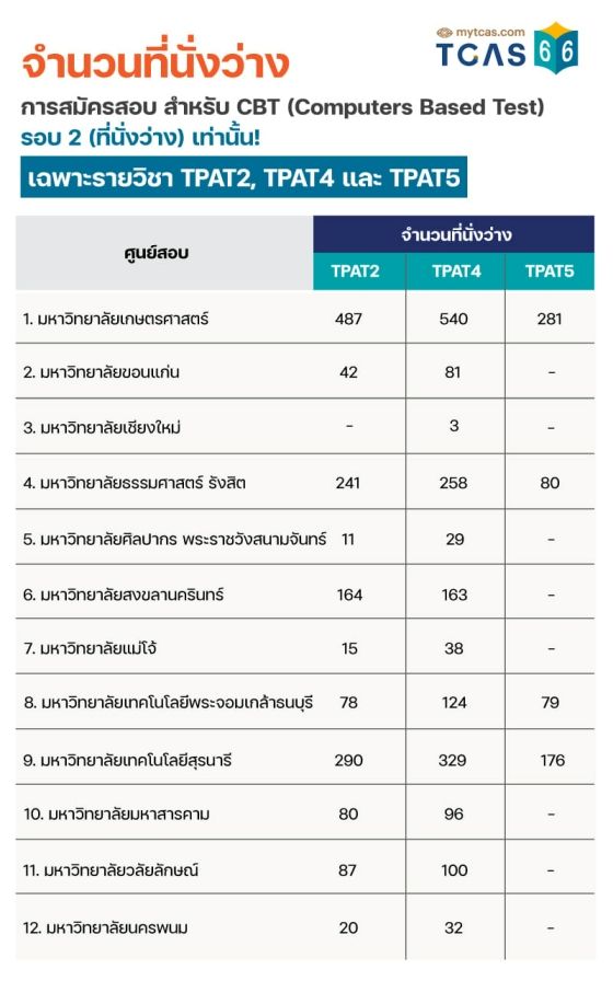 ในการเปิดรับรอบ 2 มี 3 วิชาที่ว่างคือ TPAT2, TPAT4 และ TPAT5 เท่านั้น
