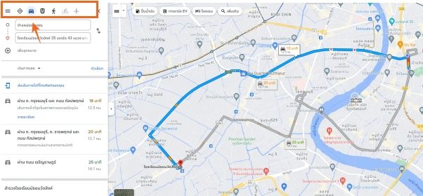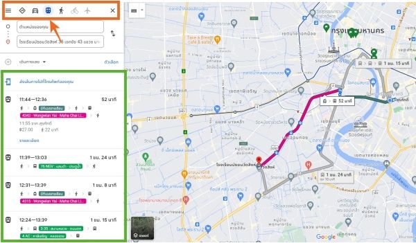 หากเป็นจังหวัดที่เดินทางด้วยรถสาธารณะได้ สามารถกดที่รูปหน้าตาคล้ายรถไฟ google map ก็จะโชว์เส้นทางที่เดินทางด้วยรถสาธารณะให้ค่ะ