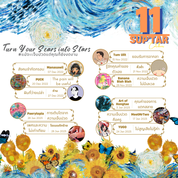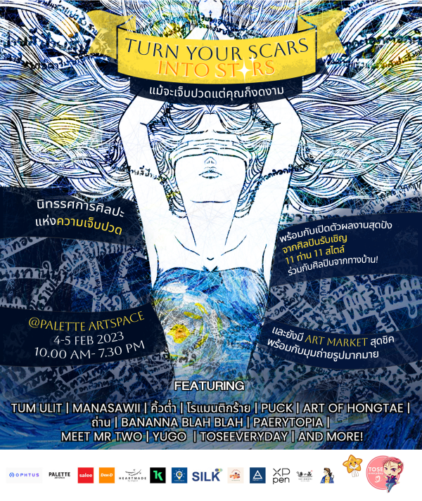 สำหรับใครที่ชอบเสพงานศิลปะ หรือนักเขียนคนไหนที่กำลังมองหาแรงบันดาลใจดีๆ ในการเขียนนิยาย งานนิทรรศการศิลปะครั้งนี้ก็เป็นอีกงานกิจกรรมดีๆ ที่ไม่ควรพลาดเลยค่ะ แต่หากใครไม่สะดวกไปเดินเที่ยวในงาน แนะนำในไปมุงติดตามความเคลื่อนไหวในเพจ Turn Your Scars into Stars #แม้จะเจ็บปวดแต่คุณก็งดงาม ในเพจก็มีกิจกรรมดีๆ รอให้ร่วมสนุกอีกมากมาย ไม่ว่าจะเป็นการไลฟ์สดจากศิลปินสุดปัง กิจกรรมแชร์เรื่องราวความเจ็บปวดดีๆ ที่จะมาสร้างแรงบันดาลใจในการใช้ชีวิต ใครที่ไม่ว่างไปวันงาน ก็มารอมุงกันที่เพจนี้ได้เลยค่า