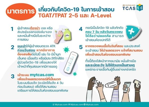 สวัสดีค่ะ ท่ามกลางกระแสเรื่องโควิดจะกลับมาระบาดอีกครั้ง อาจทำให้น้องๆ และผู้ปกครองหลายคนเกิดความกังวลว่าการจัดสอบ TGAT/TPAT 2-5 และ A-Level ที่ดำเนินการจัดสอบเร็วๆ นี้ จะมีมาตรการอย่างไรบ้าง และถ้าเกิดติดโควิดก่อนสอบไม่กี่วัน จะสามารถเข้าสอบได้หรือเปล่า