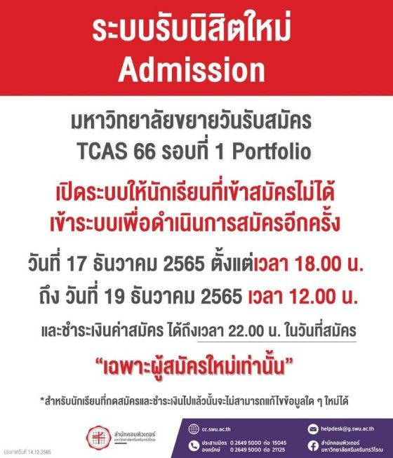 ระบบรับสมัครใหม่จะเปิดวันที่ 17 ธค 65 ตั้งแต่เวลา 18.00 น. - วันที่ 19 ธค.65 เวลา 12.00 น. และชำระเงินค่าสมัครได้ถึงวันที่ 19 ธค.65 เวลา22.00 น.