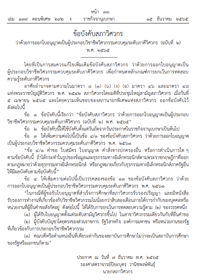 ซึ่งล่าสุดได้มีประกาศราชกิจจานุเบกษา "ข้อบังคับสภาวิศวกร ว่าด้วยการออกใบอนุญาตเป็นผู้ประกอบวิชาชีพวิศวกรรมควบคุมระดับภาคีวิศวกร (ฉบับที่ 2) พ.ศ. 2565" ออกมา ซึ่งมีการเพิ่มข้อยกเว้นเกี่ยวกับการออกใบอนุญาตฯ ด้วย
