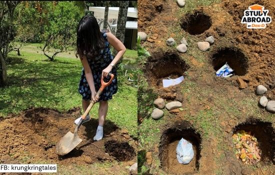 พอจบคอร์สพื้นฐาน เราจะแยกย้ายกันไปเรียนวิชาเอกของตัวเอง อย่างพี่ก็ไปเรียนต่อด้านสิ่งแวดล้อม มีออกฟิลด์ทริป ดูฟาร์ม ป่า บริษัทแปรรูปพลาสติกใช้แล้ว ฯลฯ // ด้านล่างนี้คือรูปตอนเรียนวิชาเอกตัวแรกแล้วได้ไปขุดดิน ฝังวัสดุต่างๆ ลงในนั้น แล้วกลับมาดูการเปลี่ยนแปลงหลังผ่านไปสักระยะ