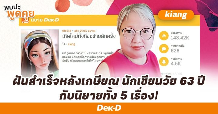 เกี้ยง หรือนักเขียนนามปากกา kiang เจ้าของผลงานสุดฮิตเรื่อง เกิดใหม่ทั้งทีขอร้ายสักครั้ง และ อี่ฝานนางร้ายเปลี่ยนชะตา เธอเป็นนักเขียนมือใหม่วัยเกษียณที่เพิ่งเริ่มต้นเขียนนิยายได้ไม่นาน ก่อนหน้านี้ เกี้ยงเคยทำงานเป็นอาจารย์พิเศษสอนบัญชีมาก่อน พอเลิกทำงานแล้วมาเป็นแม่บ้านเต็มตัว ทำให้เธอรู้สึกว่างและเหงามากๆ เลยเข้าเว็บไซต์ Dek-D ไปอ่านนิยาย อ่านกระทู้ต่างๆ รวมถึงอ่านบทความสัมภาษณ์นักเขียนหลากหลายอาชีพ จนเธอเกิดแรงบันดาลใจ อยากลองเขียนนิยายตามความฝันของตัวเองดูบ้าง