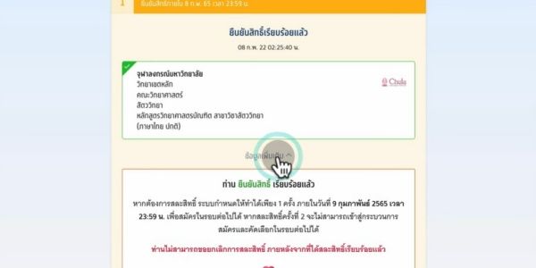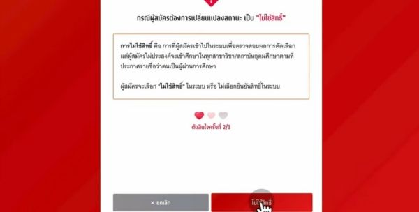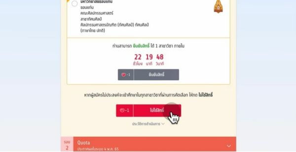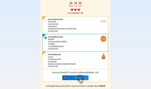 ให้เลือกคณะ/สาขานั้นๆ แล้วกดยืนยันสิทธิ์ ในขั้นตอนนี้จะเปลี่ยนใจได้สูงสุด 3 ครั้ง ในปีก่อนๆ ทปอ. ใช้สัญลักษณ์ "หัวใจ" แทนจำนวนครั้งที่เหลือที่น้องๆ สามารถเปลี่ยนแปลงการเลือกได้
