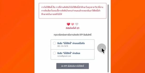 เมื่อกดเลือกไม่ใช้สิทธิ์ไปแล้ว ระบบจะแสดงคำเตือนขึ้นมาว่าตอนนี้กำลังเลือก "ไม่ใช้สิทธิ์" ถ้ายืนยันการเลือกก็ให้กด "ไม่ใช้สิทธิ์" อีกครั้ง และกดช่องทางรับ OTP ตามปกติ