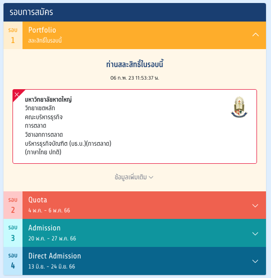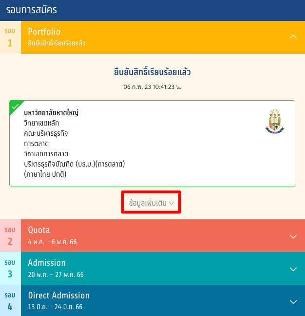 เมื่อเข้าสู่ระบบ myTCAS ในวันที่ 9 กุมภาพันธ์ 2566 ให้กดไปที่ "ข้อมูลเพิ่มเติม" ตรงบริเวณรอบการสมัคร รอบ 1 Portfolio