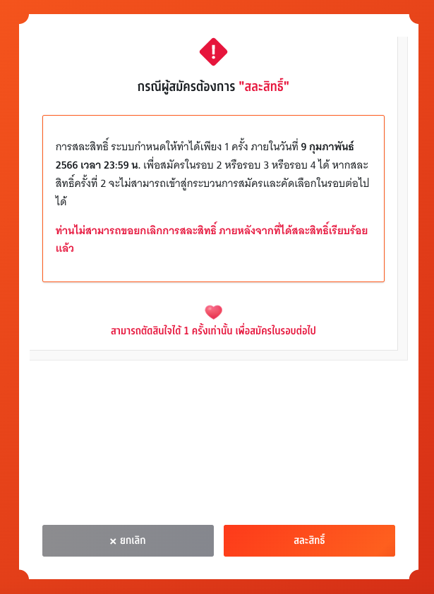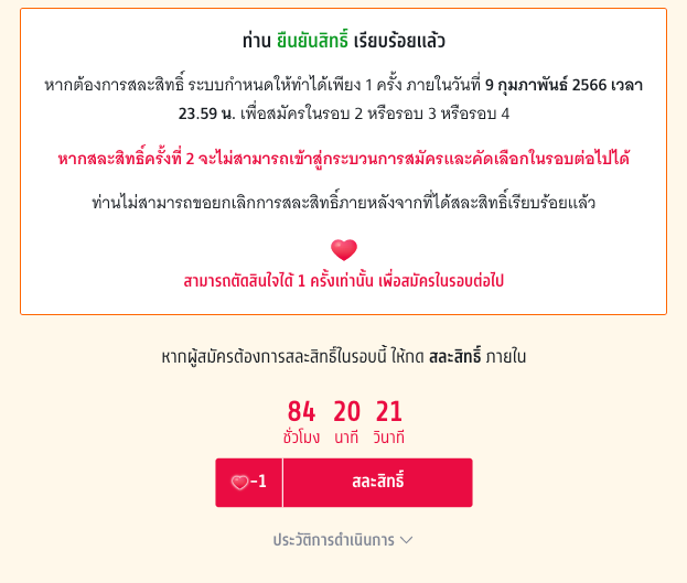 ระบบจะแสดงรายละเอียดต่างๆ เกี่ยวกับการสละสิทธิ์ พร้อมแจ้งเงื่อนไขต่างๆ เมื่อน้องๆ ตัดสินใจว่าจะสละสิทธิ์ ให้กดปุ่มสละสิทธิ์สีแดง ย้ำ! ว่ามีแค่โอกาสเดียวเท่านั้น ในการสละสิทธิ์