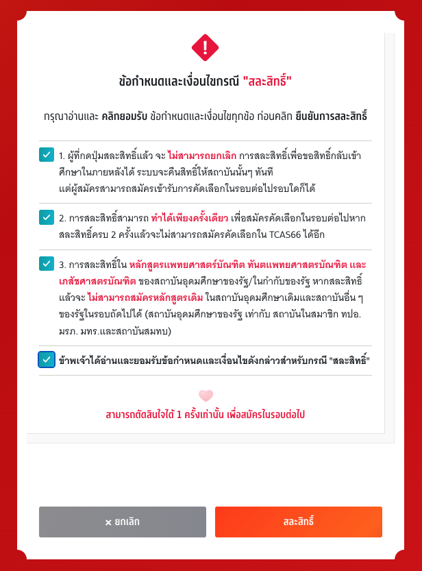 ระบบจะชี้แจงข้อกำหนดและเงื่อนไขกรณีสละสิทธิ์ ให้น้องๆ อ่านแต่ละข้อให้ละเอียดรอบคอบ และคลิกยอมรับทุกข้อให้เรียบร้อย ก่อนที่จะกด "สละสิทธิ์" แต่ถ้าใครต้องการเปลี่ยนใจ ไม่อยากสละสิทธิ์แล้ว ให้กด "ยกเลิก"