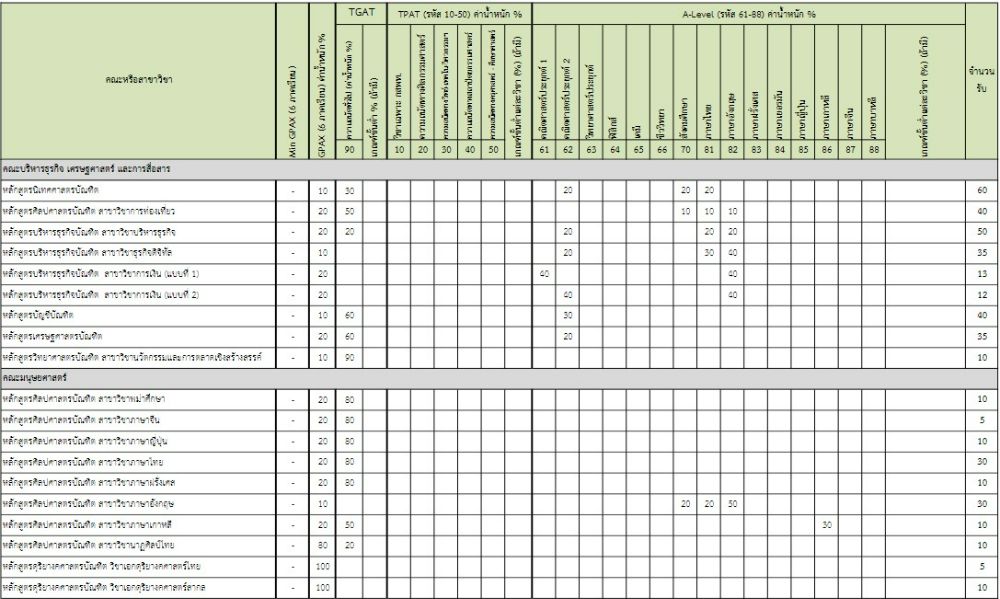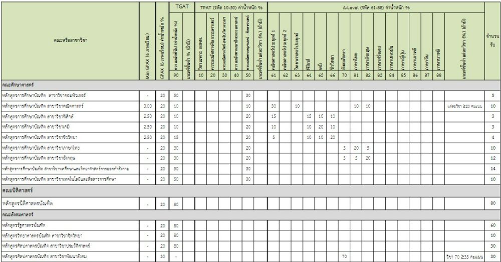 - สังคมศาสตร์ มี 3 สาขา คือ รัฐศาสตร์, จิตวิทยา และประวัติศาสตร์ ใช้ GPAX 20% + TGAT 80% เช่นกัน