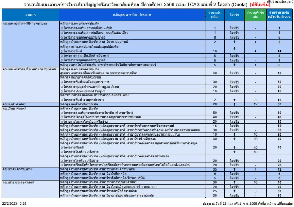 ดังนั้น สรุปแล้วจำนวนรับรอบ 2 โควตา ม.มหิดล ฉบับอัปเดตวันที่ 22 กุมภาพันธ์ เพิ่มจำนวนรับจาก 1,309 ที่นั่ง เป็น 1,675 ที่นั่ง โดยมีกำหนดการรับสมัคร 1 มีนาคม - 7 เม.ย. นี้