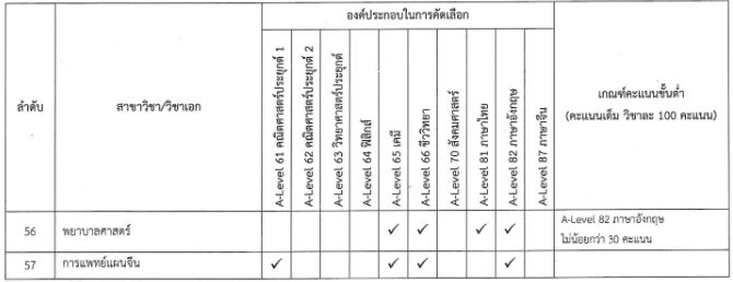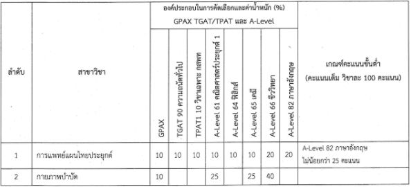 6. สาขาวิชาการแพทย์แผนไทยประยุกต์ มีใช้คะแนนกลุ่มวิชา TGAT/TPAT 2 ตัว คือ TGAT ความถนัดทั่วไป และ TPAT1 วิชาเฉพาะ กสพท ใครจะสมัครสาขานี้จะต้องมีคะแนนวิชาเฉพาะ กสพท ด้วย ส่วน A-Level ใช้วิชา คณิต 1, ฟิสิกส์, เคมี, ชีววิทยา และภาษาอังกฤษ