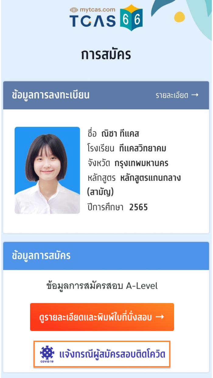 เข้าไปที่ระบบ myTCAS หรือ https://student.mytcas.com ซึ่งเมื่อเข้าสู่ระบบเรียบร้อยแล้ว ระบบจะขึ้น ข้อมูลการสมัครสอบ A-Level และด้านล่าง จะมีปุ่ม "แจ้งกรณีผู้สมัครสอบติดโควิด" อยู่