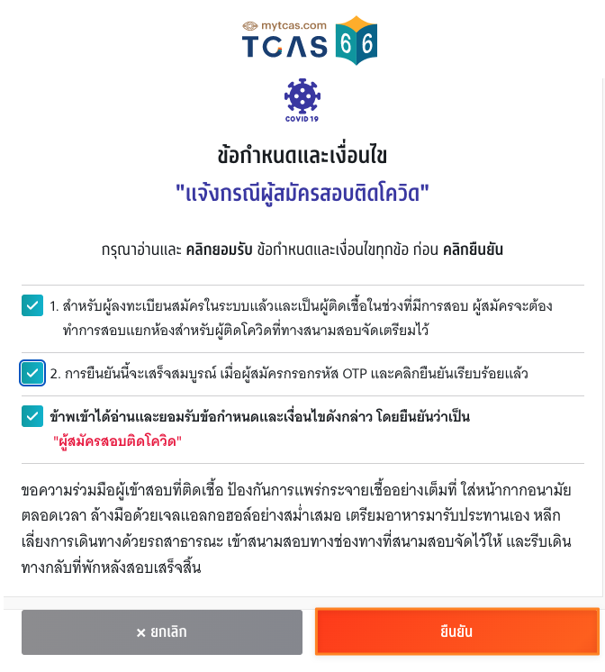 - หากตรวจพบเชื้อในวันที่สอบ และประสงค์จะเข้าสอบ ให้ลงทะเบียนในระบบ แล้วนำผลตรวจ ไปแจ้งที่สนามสอบ เพื่อเข้าสอบในห้องสอบแยกพิเศษ และระมัดระวัง ไม่ให้ตัวเองเป็นสาเหตุแพร่กระจายเชื้อกับผู้อื่นอย่างเคร่งครัด
