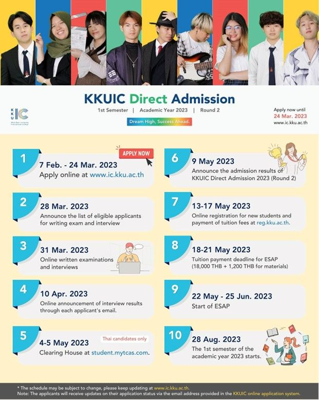 KKUIC เปิดรับนักศึกษาใหม่ (หลักสูตรนานาชาติ) ครั้งที่ 2 ประจำปีการศึกษา 2566 ระดับชั้นปริญญาตรีจำนวน 7 สาขา รวมทั้งหมดกว่า 70 ที่นั่ง ได้แก่สาขา