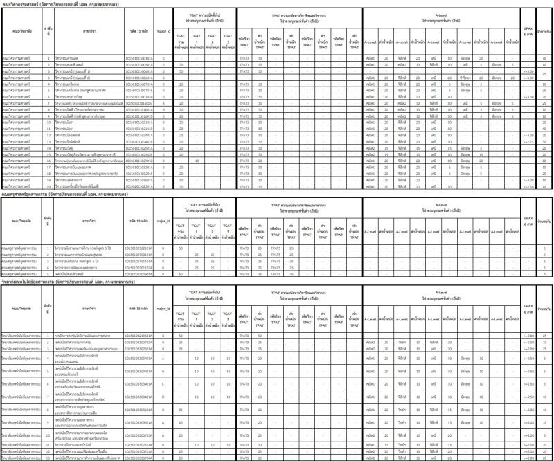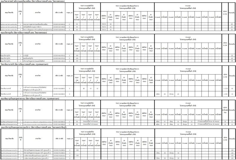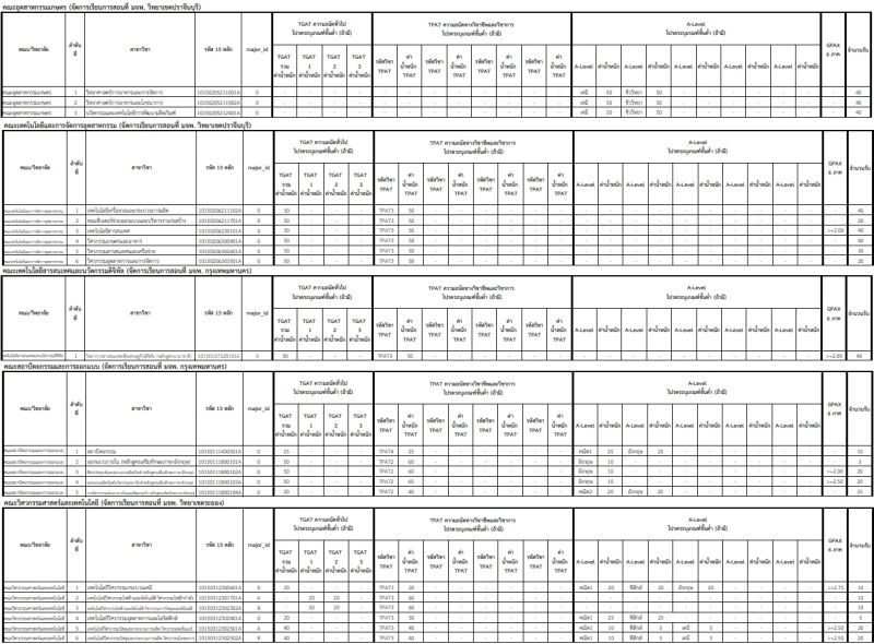 - คณะวิศวกรรมศาสตร์และเทคโนโลยี สาขาวิชาเทคโนโลยีวิศวกรรมไฟฟ้าและอัตโนมัติ-วิศวกรรมการวัดคุมและอัตโนมัติ ใช้ TGAT1 20% + TGAT2 20%