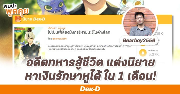ใครที่มีความฝันอยากเป็นนักเขียน หรือกำลังรู้สึกท้อแท้อยู่ ลองมาอ่านเรื่องราวของ Bearboy2556 นักเขียนสู้ชีวิตที่ไม่ยอมแพ้บนเส้นทางนักเขียนแห่งนี้กัน เชื่อว่าจะต้องมีเรื่องราวดีๆ ส่งต่อถึงนักเขียนทุกคนได้แน่นอน