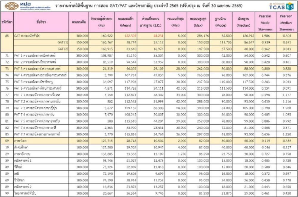 - ค่าสถิติพื้นฐาน GAT/PAT, วิชาสามัญปี 65 (ฉบับที่ 2 ฉบับแก้ไข)