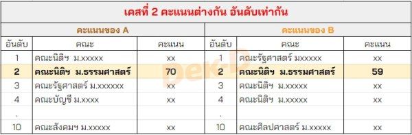 เคสนี้ เหมือนกับเคสที่ 1 เพราะระบบจะพิจารณาคะแนนก่อนเสมอ แม้จะวางไว้ที่อันดับเดียวกัน แต่ A เป็นคนที่ได้คะแนนมากกว่าก็จะเป็นคนที่ได้ที่นั่งสุดท้ายไป ส่วน B จะได้ไปพิจารณาอันดับ 3