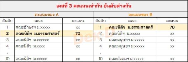 เมื่อการพิจารณาคนเข้าเรียนดูที่ "คะแนน" เป็นหลัก หากมีคนได้คะแนนเท่ากันในที่นั่งสุดท้าย อันดับก็ไม่มีผลอะไรอยู่ดีค่ะ เพราะสุดท้ายแล้ว คณะจะเป็นคนพิจารณาเองว่าจะรับหรือไม่รับ นักเรียนทั้ง 2 คนนี้ หากรับ ก็จะได้เข้าเรียนทั้ง 2 คน แม้ว่าจะเกินจำนวนรับก็ตาม แต่ถ้าปฏิเสธไม่รับ ก็จะไม่ได้เรียนทั้ง 2 คน