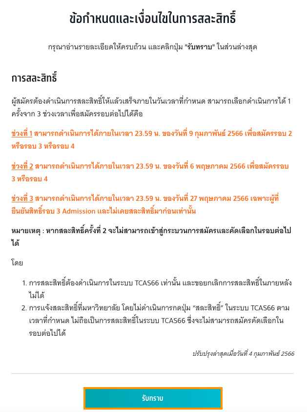 เมื่อเข้าสู่ระบบ ในวันที่ 6 พฤษภาคม 2566 ระบบจะแสดงข้อกำหนดและเงื่อนไขในการสละสิทธิ์