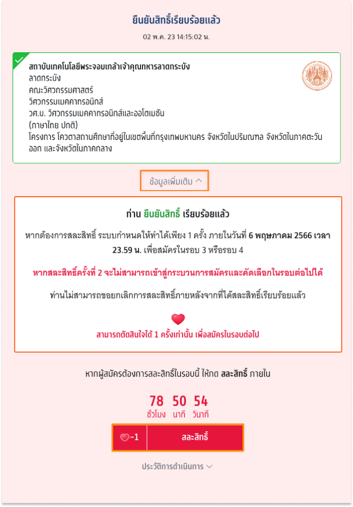 ระบบจะแสดงรายชื่อสาขาวิชาที่ยืนยันสิทธิ์เรียบร้อยแล้ว ใครเคยยืนยันสิทธิ์ที่รอบใด ระบบก็จะแสดงรอบนั้นมาให้ จากนั้นถ้าใครต้องการสละสิทธิ์ ให้กดที่ "ข้อมูลเพิ่มเติม"
