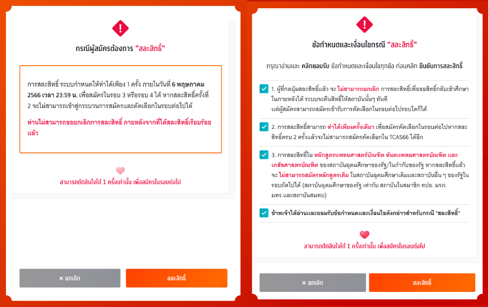 ย้ำอีกครั้ง! ใครที่เคยยืนยันสิทธิ์ไปแล้ว และอยากไปสมัครรอบ Admission หรือรอบ Direct Admission จะต้องดำเนินนการสละสิทธิ์ในวันที่ 6 พฤษภาคม 2566 นี้เท่านั้น