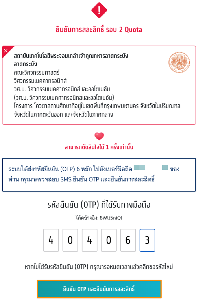 ระบบจะให้ตรวจสอบความถูกต้องอีกครั้ง จากนั้นให้เลือกช่องทางรับรหัส OTP และนำรหัสมากรอกให้เรียบร้อย เพื่อยืนยันว่าต้องการจะสละสิทธิ์จริงๆ