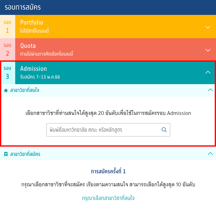 ไปที่เว็บไซต์ mytcas และเข้าสู่ระบบให้เรียบร้อย เมื่อระบบแสดงรอบการสมัคร ให้กดลูกศรลง ตรงรอบ 3 Admission จากนั้นระบบจะให้เลือก "20 สาขาวิชา" ที่สนใจ โดยจะเลือกครบทั้ง 20 เลยก็ได้ หรือเลือกแค่ 10 สาขาวิชาที่ต้องการสมัครก็ได้