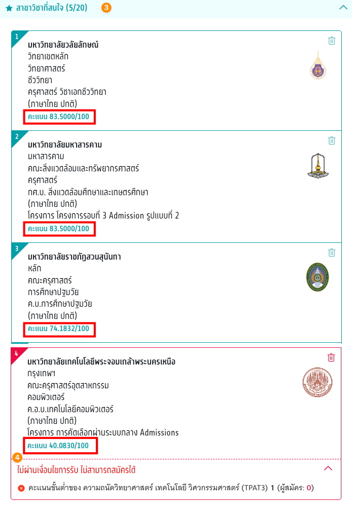 โดยระบบจะแสดงคะแนนที่คำนวณตามเกณฑ์การคัดเลือกของแต่ละสาขาวิชาไว้ด้วย ตรงนี้ให้น้องๆ เช็กความถูกต้องของคะแนนด้วย (ระวัง! บางมหาวิทยาลัยใช้คะแนน T-Score) แต่ถ้าคุณสมบัติไม่ผ่าน หรือคะแนนไม่ถึงเกณฑ์ขั้นต่ำ ระบบก็จะแจ้งเตือนด้วยเช่นกัน