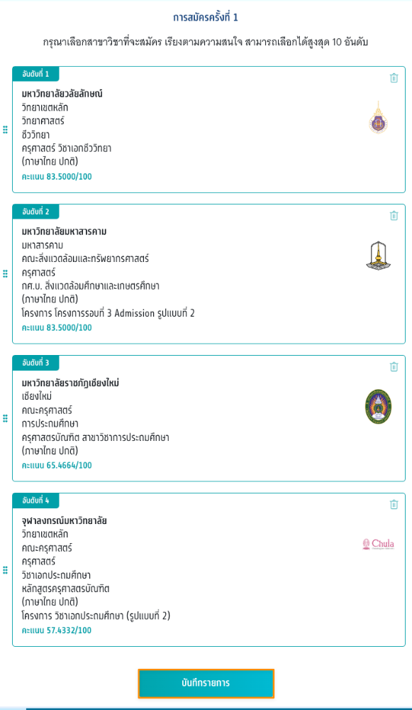 ตรวจสอบสาขาวิชา และอันดับที่สมัครไว้ หากถูกต้องเรียบร้อยแล้ว ให้กด "บันทึกรายการ"