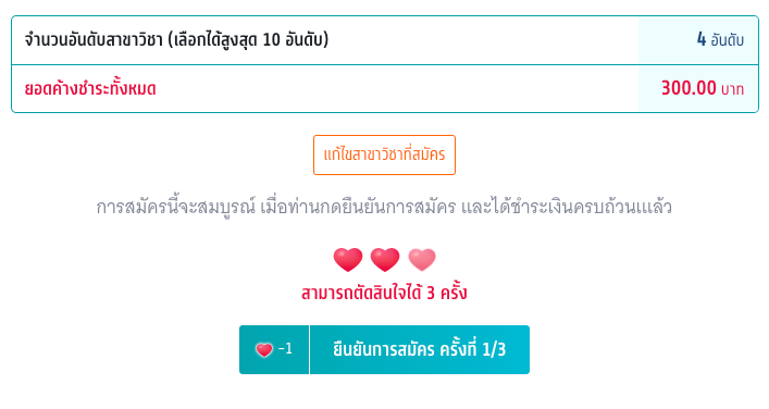 ระบบจะแจ้งจำนวนอันดับสาขาวิชาและยอดค้างชำระทั้งหมด นอกจากนี้ยังมีปุ่ม "แก้ไขสาขาวิชาที่สมัคร" ให้กลับไปแก้ไขอันดับ/สาขาวิชาในการสมัครก่อนที่จะยืนยัน OTP ได้ (ตรงนี้หากยังไม่กดยืนยัน OTP จะกลับไปแก้เท่าไหร่ก็ได้) แต่ถ้าหากมั่นใจแล้ว ก็ให้เลือก "ยืนยันการสมัคร" ได้เลย ซึ่งการยืนยันตรงนี้ จะทำได้สูงสุด 3 ครั้ง (ตามจำนวนหัวใจ)