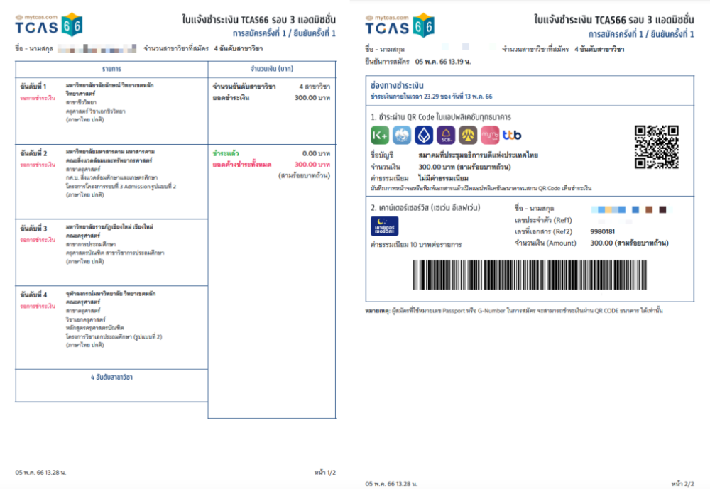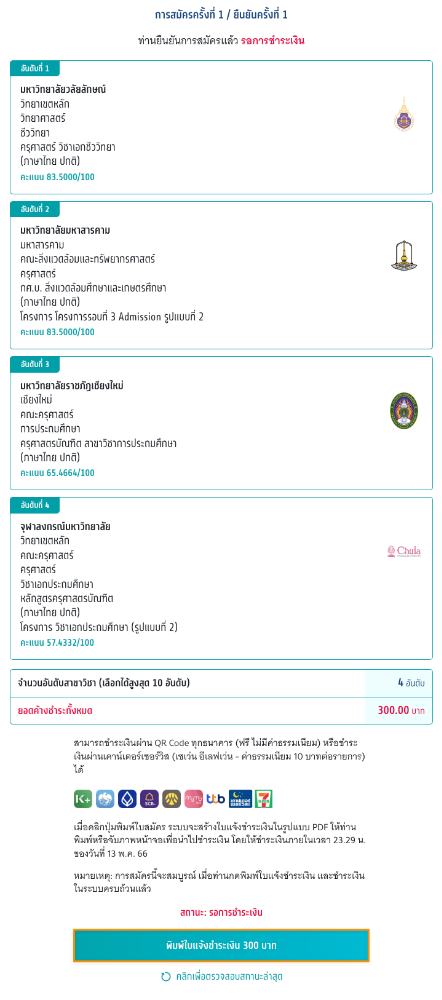 กดปุ่ม "พิมพ์ใบชำระเงิน" เพื่อนำไปชำระค่าสมัคร โดยจะเลือกชำระผ่าน QR code ด้วย App ของธนาคารต่างๆ หรือผ่าน Barcode ที่เคาน์เตอร์เซอร์วิส (7-11)