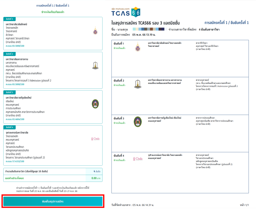 เมื่อชำระเงินเรียบร้อย ให้คลิกที่ "พิมพ์ใบสรุปการสมัคร" เก็บไว้เรียบร้อย รอประกาศผลในวันที่ 20 พฤษภาคม 2566 ได้เลย
